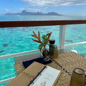 A midi, il vous dépose au restaurant flottant pour, après un Punch d’accueil, déguster une assiette découverte de poissons ou de viandes suivie d’un dessert au dessus des eaux turquoise et transparentes du lagon et face à l’ile de Moorea qui se découpe sur l’horizon. Retour pour 14h.